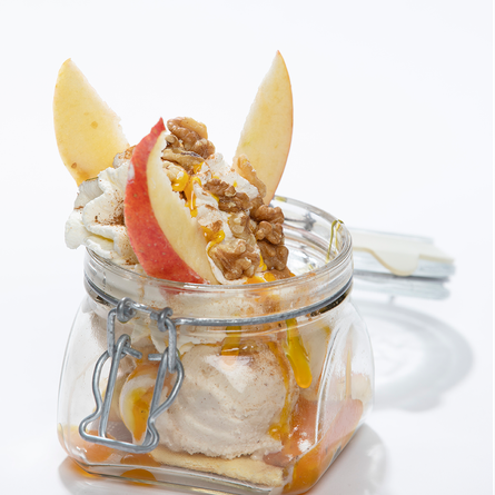Apfelstrudel- und Vanilleeis, Schlagobers, Nüsse, Zimt und Karamell erinnern an Oma's Apfelstrudel.